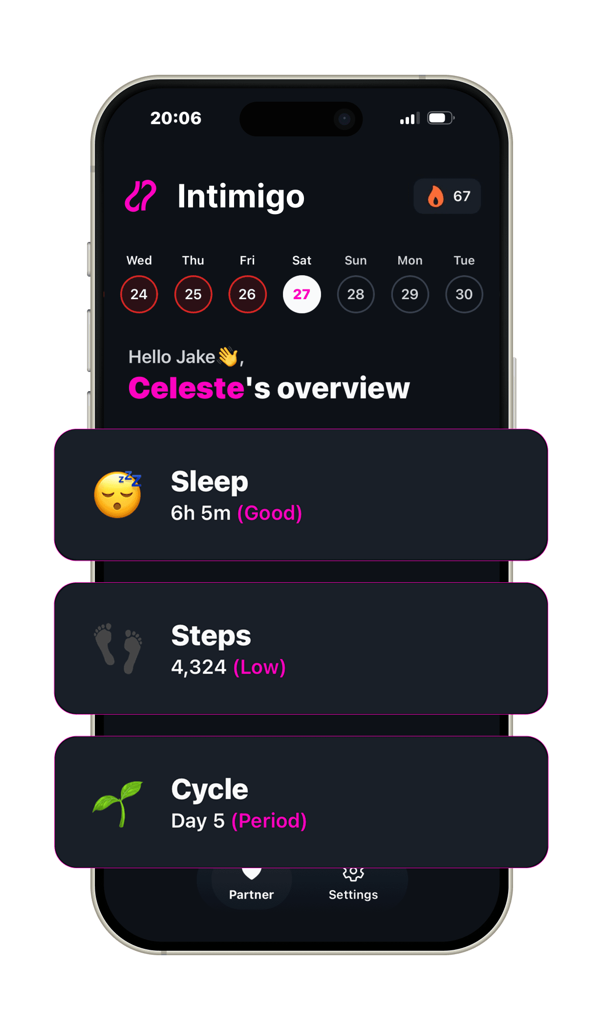 Intimigo syncs with devices to track health related metrics. No manual logging needed, just connect and understand your partner's patterns.
